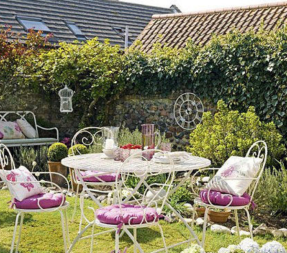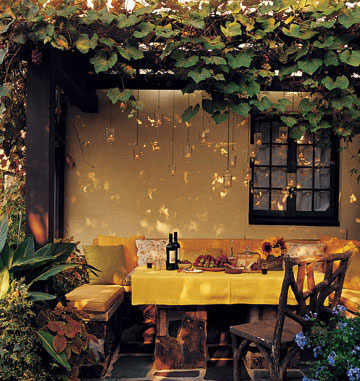 在绿色的树荫下,挂上点点小灯,在黄昏时刻,墙面上的斑驳图案,营造了一种恬静悠闲的味道。再摆放上一个长形餐桌,铺上暖黄色的桌布,一家人围坐在一起,其乐融融氛围,情与景的完美结合。