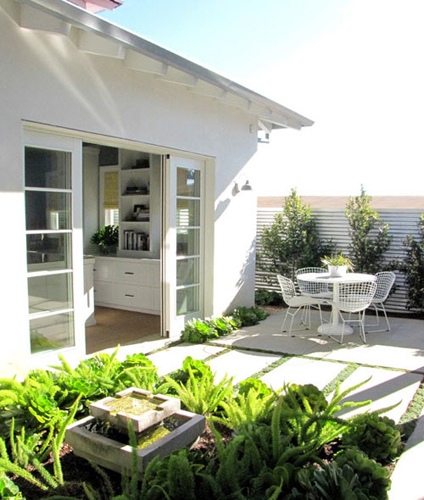 直接将餐桌搬到住宅的外面,享受浓浓的绿意和温暖的阳光。白色的餐桌椅和白色墙面交相呼应,使整个空间散发着一种纯然清爽的味道。小巧餐桌一点也不会占用空间,另一侧种植上大片绿色植物,让空间充满绿意。
