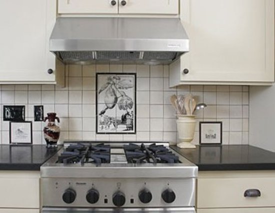你可曾想过,油腻腻的厨房也可以用相框来装扮。厨房防溅板中心的瓷砖拼接出的黑色画框十分巧妙,与两旁的黑色画框相映成趣。