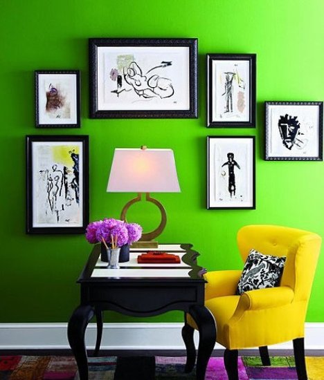 高饱和度的亮绿色墙面过于扎眼,室内后期软装颜色跳跃性也非常大。因此,为了中和视觉感,室内家具选择了黑色来作为装饰,墙面也相应选取了黑色画框作为背景墙打造。