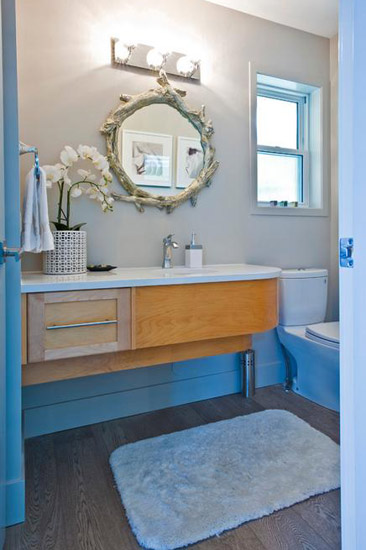 装饰tips:给卫生间赋予一种情感,最简单的方法便是使用灯光的软装饰。一缕海底蓝色的光源萦绕在卫生间里面,身处洗手间里面犹如置身神秘的海洋馆。仿生的树根边围绕起来的镜子使卫生间在蓝色的光线底下更添神话般的气息,一旁雪白的兰花则带领整个空间脱离繁华俗世,显得高傲而贵气。