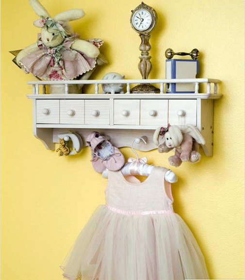 迷你的木质搁架设计可谓紧跟如今的家装潮流,架子上可以展示孩子最喜欢的小饰品,而搁架下方的六个小木盒精致可爱,本身就是一种装饰品,而且还可让各种小玩具小物件实现分类收纳的目的。小木盒下方的挂钩还可以挂些小玩意,用来悬挂布娃娃的公主裙再好不过了!