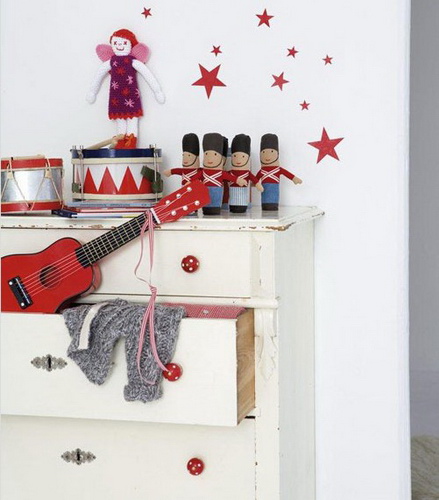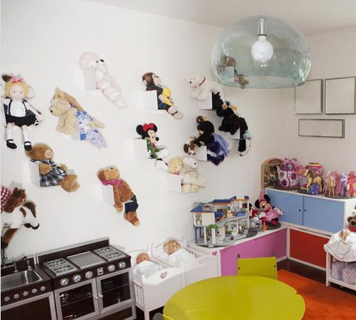 布娃娃多得放不下了,可孩子们看到新的还是会吵着你要。旧的布娃娃要怎么处理?把它们在墙上的搁架上一一展现吧,这样壮观的布娃娃阵势也是儿童房里最有童趣的装饰,可以教孩子们更换布娃娃的位置,呈现不一样的墙面风景。
