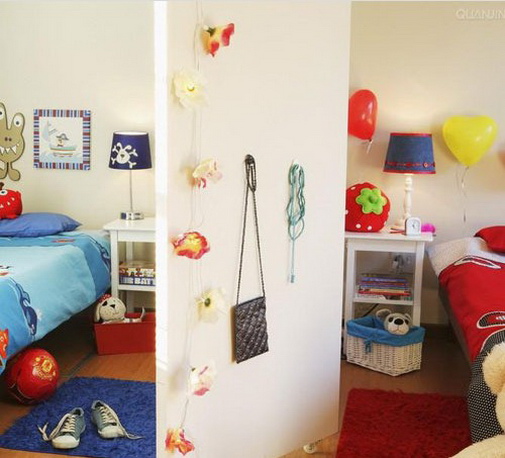 可移动的隔断墙可以巧妙地将一个空间变为两个,完美解决了两个孩子的卧室问题。?而两边的墙都可以成为包包或其它小东西的收纳空间,配合收纳小箩筐,空间虽小却能高效利用。