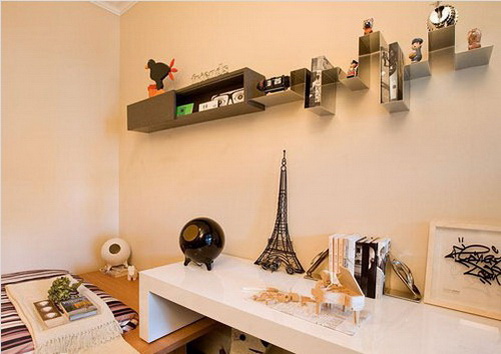 不规则的收纳搁架会让孩子们在摆放装饰品时充满乐趣,放在不同高度的搁架可能就会呈现不同的效果,这种富于变化的收纳方法会激发孩子的探索精神。