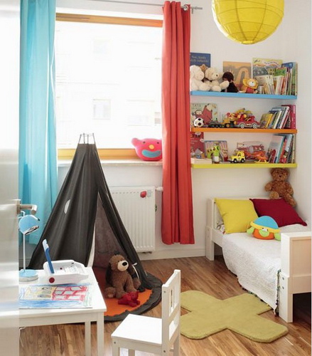 即使不在造型上做变化,缤纷的色彩也能给收纳增添乐趣。为孩子买一个像野外露营用的小帐篷,这里会是孩子最想呆的小空间。而这个帐篷也可以同时成为布娃娃和玩具的收纳之地。