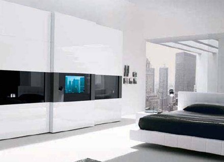 想在卧室看电视,又不想牺牲能够摆放家具(卧室家具巧摆放-打造安心睡眠空间)的墙面,可以选择这款把液晶电视嵌入柜门的款式。集成的设计解决了双重功能,省力又有科技感。靠近电视的移门内部,可以设计放影音设备的层板,即使是在卧室也能体验专业视听效果,下面小编带你欣赏简单的衣柜图吧室内空间搭配。