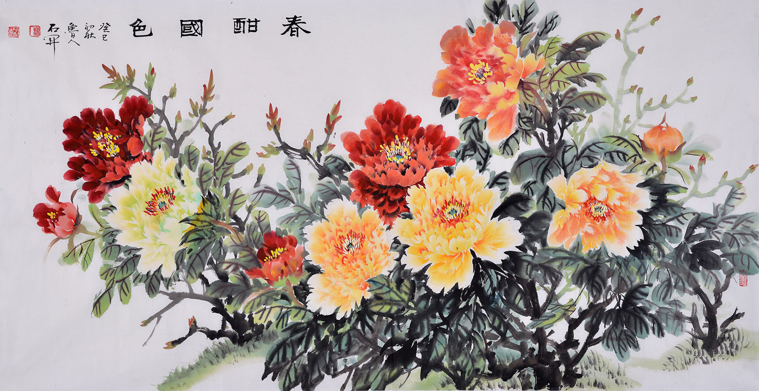 牡丹花色鲜明可爱又鲜艳,花朵绚烂大气,画轴挺拔,仰着头向阳,有金子之花的赞美的称呼,饱含 正向积极能量,是吸引贵人益友、远离小人的最佳表征。在家中玄关、客厅或卧室挂此画,可提高全家 火炽运势,吸引贵客临门,近贵远祸,前程飞黄腾达,一片天日似锦。