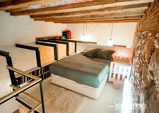 编辑点评:与黑色金属支撑横梁连成一体的矮柜为卧室创造了收纳空间,同时也成为卧室的隔断墙,保证了安全也保护了隐私。把婴儿床放在墙壁与大床之间,安全又方便。古旧的吊顶和墙壁让卧室充满质感。