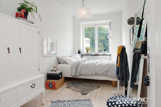 编辑点评:卧室家具改变了传统的由左到右的横向摆放,选择竖向摆放,使长方形卧室的每一寸地方都能被利用,布局显得更加紧凑和得当。床铺靠窗摆放让睡眠区光线充足。