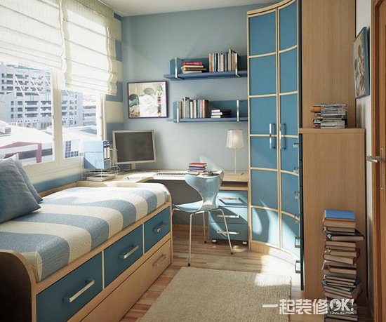 编辑点评:6平米左右的卧室在紧贴墙壁设置的充足收纳空间的帮助下显得整洁舒适,井井有条。单人床的底部被打造成收纳柜,充分地利用了空间。