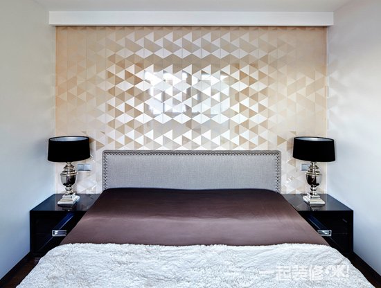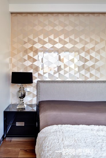 编辑点评:床头背景墙采用凹凸感强的胶面墙纸作装饰,砂面和亮面交替的三角形图案营造出独特的视觉跳跃感,提升了卧室的活力和质感。
