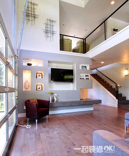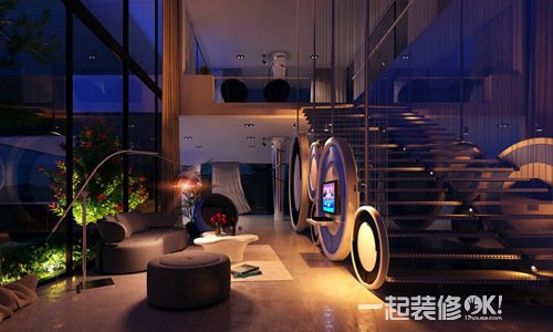 电视背景墙并不一定要设计在主墙体上,通过突发奇想,每个角落都可能成为电视机的立足之处。楼梯间的侧面,用几个大圆盘作了十分美丽的装饰,电视机就被安置在圆盘之中,而沙发区则面对圆盘靠着落地窗摆设,原本不起眼的过道瞬间华丽变身。