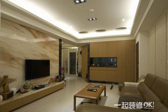 电视柜用色泽温润的木皮柜面,提早预告了空间中的人文质感。大理石铺设的电视背景墙,细腻的纹路让整个客厅充满了一种自然的感觉。