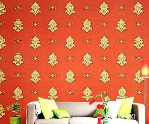装修墙纸效果图:鲜红的底色搭配金黄色的图案,十分契合家中轻松俏皮的风格,再搭配素色的沙发,可以彰显主人的气质。