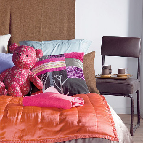 即使你的床很单调,加上鲜艳橙色调的丝绸床品就能达到醒目的效果。不同丝绸面料拼接的靠包,也能共同提升卧室的华丽感。