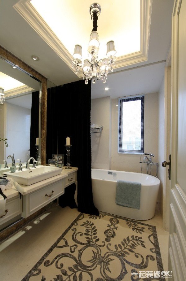 大面积的卫生间在墙砖的颜色可以选择深色系的颜色,中间搭配浅色系的腰线或者底部搭配浅颜色的踢脚砖,这样做的目的是减少整个墙面的沉闷感。卫生间地砖颜色可以和墙砖相同的颜色,但是洁具的颜色一定要选用浅色系的,这样整体效果才会显得尊贵大气。