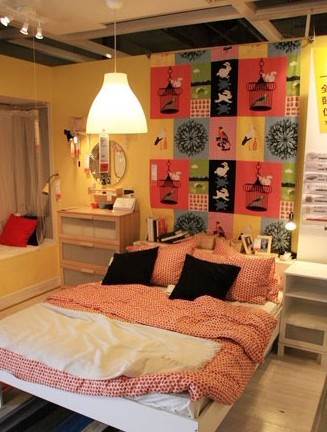 五彩斑斓的色彩不光属于夏天,适当搭配同样也能把居室装点成一个多彩之秋。无论是五彩的格子卡通画背景墙饰还是条纹地毯,亦或是红色的波点床品,看似随意的搭配,实则都紧密关联,有条有理。此外,选择运用柔软绵厚的材质,更能增加温暖的感觉,而房顶的暖黄色吊灯,则更加烘托了这种氛围。