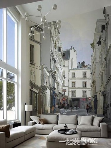 在挑高的客厅空间中,以立体街景图为沙发背景实为创意中的创意,在丰富空间层次的同时,还在视觉上达到了延伸客厅空间的效果,一眼望去,整个沙发像是在露天场景中一般,背后的街景建筑物立体的就像是真的一样。