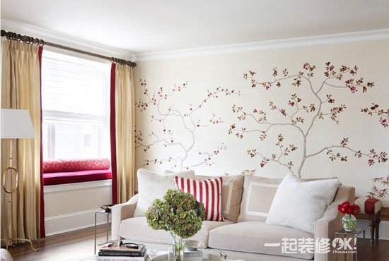在米白色墙面上,绘制一两颗小数,零星的开出红色小花的墙面是否能感觉到春天已来临的春意感呢?以淡色系为主的空间里,沙发背景墙上的点点红花显得特别抢眼。