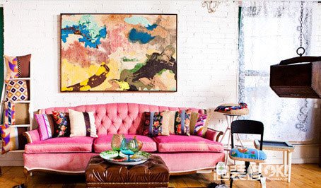 艳丽的桃粉色沙发与白色砖墙搭配,颜色丰富的抽象画挂在墙中央,瞬间就有了一种后现代的感觉,时尚中带有小小的年代感。