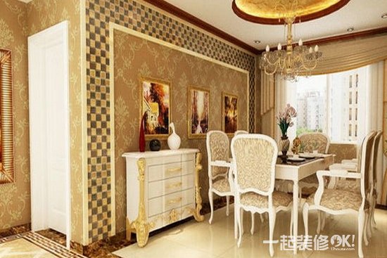 宫廷式装扮的餐厅,带给人高贵大方的享受。圆形的吊顶下是古典大气的水钻式吊灯,印花图案的简约大气餐桌餐椅,带来别致的舒适感。背景墙十分艳丽,中间是印花壁纸,两边是马赛克边框,十分具有对称复杂魅力。