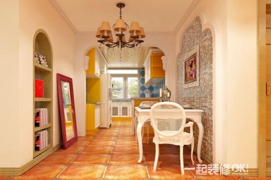 白色的吊顶,白色的墙面,带来一抹明亮与大气。美式田园风格的餐厅,内涵中透露出宁静婉约。仿古砖拼花的地板,搭配古典迷人的吊灯,让人觉得高端大气。内嵌式的圆拱形书柜,节约了空间。白色风格装饰的餐桌餐椅,背景墙是仿古石砖拼花的墙面,带来复古迷人味道。