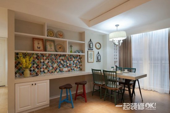 简约装扮的餐厅,透露着一分典雅舒适,实木餐椅,搭配碎花桌布,展现出美式田园风格,晶彩玻璃马赛克墙面,搭配原木色风格的地板,透露出一丝现代时尚风格,给人以大方时尚感。