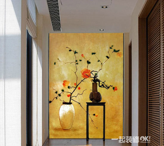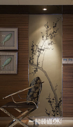小编点评:一小块的水墨背景仅仅用一个小小的吸顶灯照射,得到的效果却是挺不过的。在一片暗色的墙面上嵌上那么一块稍微明亮的地方,能瞬间提升角落的美感。