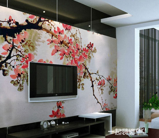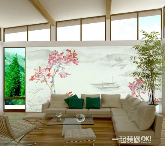 小编点评:在落地窗和客厅之间另外设计了一面绘满水墨的背景墙,仅留下了一扇窗户供人观赏窗外景色,很有一种神秘感。让人忍不住的想一探究竟。淡淡的山水配上粉嫩的花瓣,让整幅画都非常有意境。
