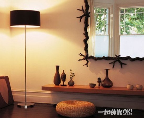 最不起眼的角落,也可以打造成一个品茶角。一个蒲团、一块靠墙脚悬挂的搁板作为狭长的茶几,造型别致的壁镜将角落“扩大”,一旁的落地灯,正释放出舒缓温馨的光源。
