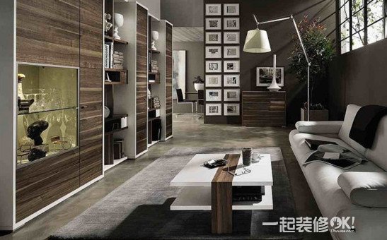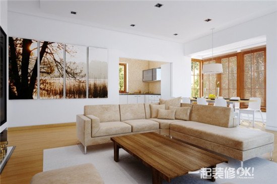 推荐理由:在L型沙发的后面的白色墙面上,设计师挂了一幅秋意浓浓的装饰画,其画面与房屋木质窗框、木质茶几色彩上相呼应。画面拼接而成,使得艺术感更强。