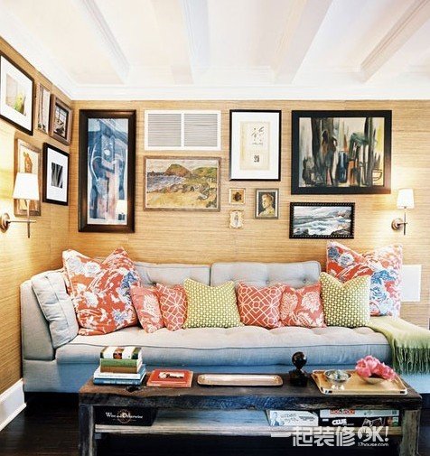 客厅中的色彩已经非常丰富鲜艳了,那么在选择照片墙上的图片时不妨考虑色彩暗淡点的,中和张扬的个性。在张贴时最好也是大小结合,长宽也不一定要一致。