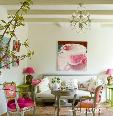 稍稍带着复古气息的小客厅,因为有了桃花的点缀,变得诗意盎然。选择同样带着粉色桃花元素的装饰画来装饰沙发背景墙,让整个客厅的气质更为一致,与粉色的台灯、座椅等如出一辙。
