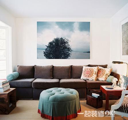 大幅的风景画可以扩充人的视野,让客厅显得更加空阔,让人心情开阔。相比照片墙,这样的装饰画更加大方典雅。棕色的绒布沙发沉稳大气,与装饰画相辅相成。