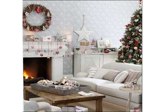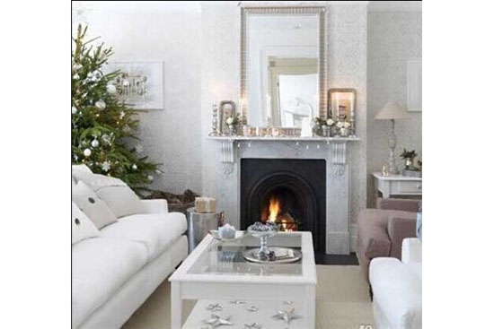 1.将温暖的米色作为家的背景色,壁炉上放置的镜子让狭小的空间瞬间增大不少。白色的布艺沙发搭配着点缀空间里的绿色圣诞树让客厅弥漫温馨的节日气息。