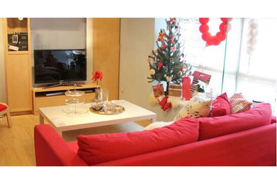 2.红色的抱枕以及毛毯在白色的沙发上特别的显眼,墙上挂着的雪花装的装饰和“圣诞快乐”的字样都让节日的氛围更加的浓郁。