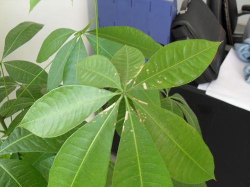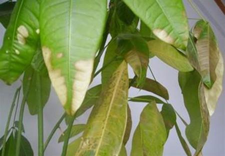 二、叶枯病 防治方法:(1)发现病叶及时摘除,并销毁; (2)在发财树的栽培过程中应加强养护管理,适时浇水施肥,每个生长季节可追施肥2-3次叶面肥,如0.5%的氮磷酸二氢钾或双效微肥的200倍液;(3)苗木从南方向北方调运之前,叶面喷施保护性杀菌剂。