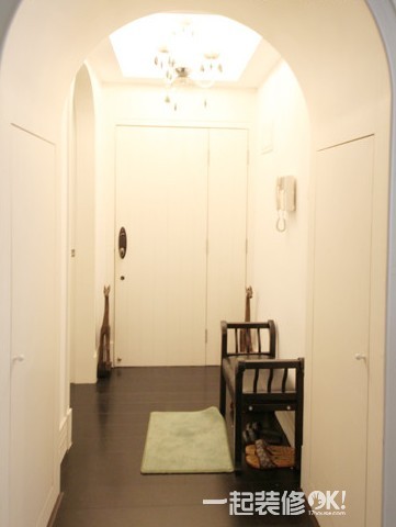 白色的墙面是为空间带来宽敞、光亮效果的永恒手段。而在玄关处拱形的门框设计正好作为空间的分隔之用,加上纯白色的运用,增加玄关的明亮度,使房子的玄关处显得宽阔、光亮。