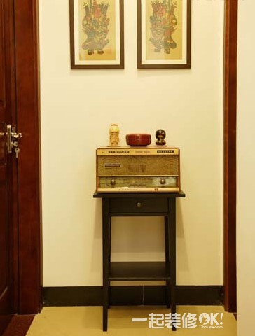 细小的玄关处摆放装饰物品的技巧不易繁杂,点到即止为佳。别有韵味的老式收音机,表面摆上2个日本娃娃,中间摆放的双喜香薰缸,简单而有意思。
