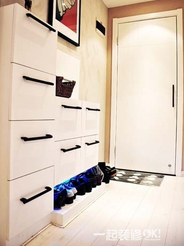 玄关是居室与外界接触的一个过渡空间,玄关里面一定的收纳空间显得必不可少,尤其是放置鞋子的位置。一片大面积的鞋柜拥有充分的空间放置鞋子,避免鞋子把多余的尘土带进室内空间。