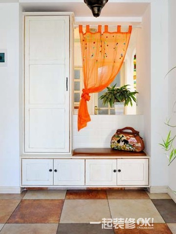 组合型的收纳柜,摆放在玄关处也显得极为合适。柜面是皮质的软包,为了方便换鞋坐着舒服。鲜橙色的窗帘更是成为玄关的一抹亮丽的风景。