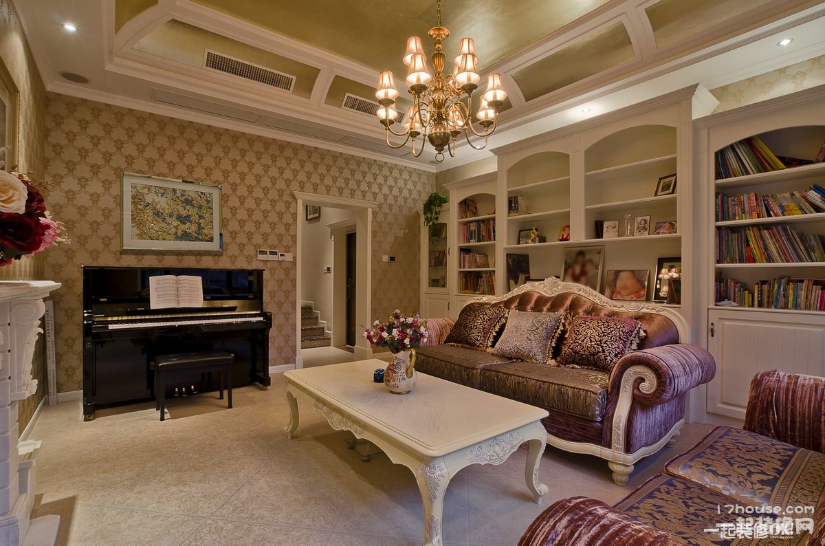 深棕色的沙发搭配乳白色的墙面,使这个客厅散发着沉稳的味道。别致的茶几和精美的吊灯,给这个空间加入了西式的元素。精致的书柜为零散的杂物提供了空间。