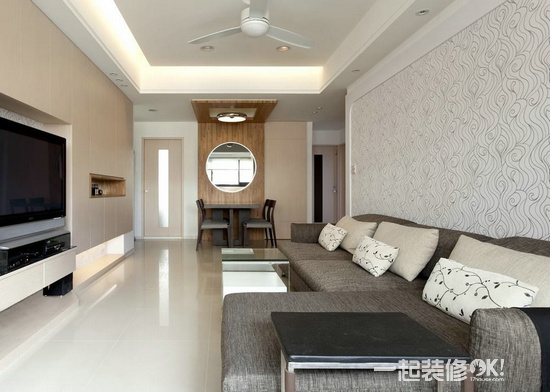 细心考虑到客厅宽度不足的问题,以浅色壁纸取代繁复的装饰手法,简单化的背景,还原空间内的舒适度。