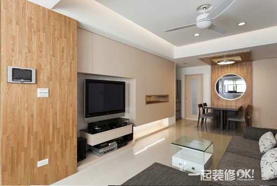 白橡木营造出极简风格,搭配单纯、浅柔的色调,带出休闲氛围,大门左侧的大柱子以温暖的集层材修饰,电视墙因梁柱产生的深度差异,正好成为客厅收纳区的不二选择。