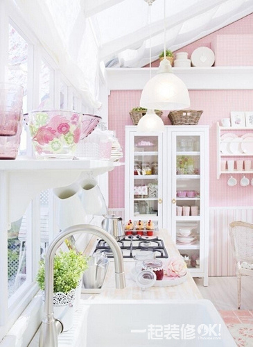 小编的话:淡粉与纯白诠释出的这间田园风厨房,整个厨房空间中都弥漫着甜蜜的气息,烹饪区紧靠窗边,让这间厨房能够常年拥有新鲜的空气,不会让油烟残留于此。