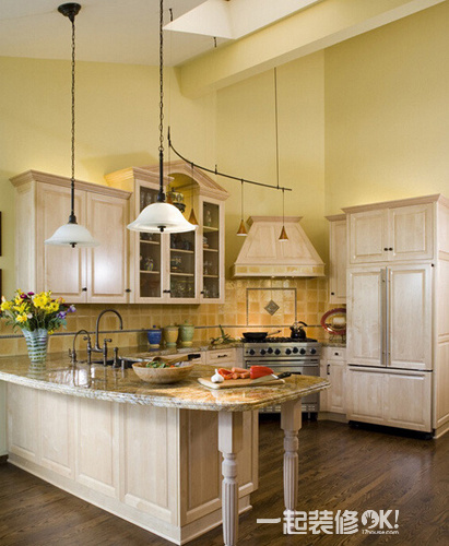 小编的话:挑高空间的厨房内,鹅黄色的墙面下,淡橙色瓷砖拼贴而成的厨房背景墙与米白色欧式橱柜结合,素色纹理大理石台面与这间厨房的整体格调很融洽。在欧式中带有田园感觉的这款厨房,整体空间看上去很宽敞,烹饪区上方的四盏小型吊灯排列有序的垂吊,而吧台上方的两盏对称吊灯也给予了吧台处适当的照明。