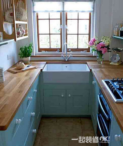 小编的话:狭长形的这款厨房,以tiffany蓝橱柜与原木色台面相结合,木质格子窗框与室内的木质元素相辅相成,让这间厨房中满是清新的田园风。