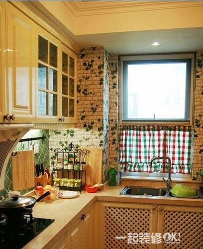 小编的话:以墙纸打造出逼真的白色砖墙上藤蔓围绕的感觉,料理区域的背景墙则以环保的绿色系菱形格瓷砖呈现,白色美式整体橱柜在这间厨房中与田园风的墙面结合更是让整间厨房有了一种美式田园风格,自由惬意的烹饪空间就如此轻松的打造出来。