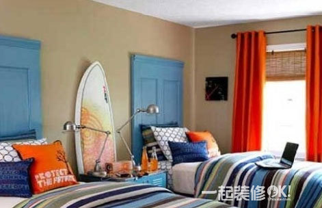 以橙色和蓝色为主色调,选用房门造型的蓝色床头板和一旁的冲浪板相搭配,衬托得很浓郁。